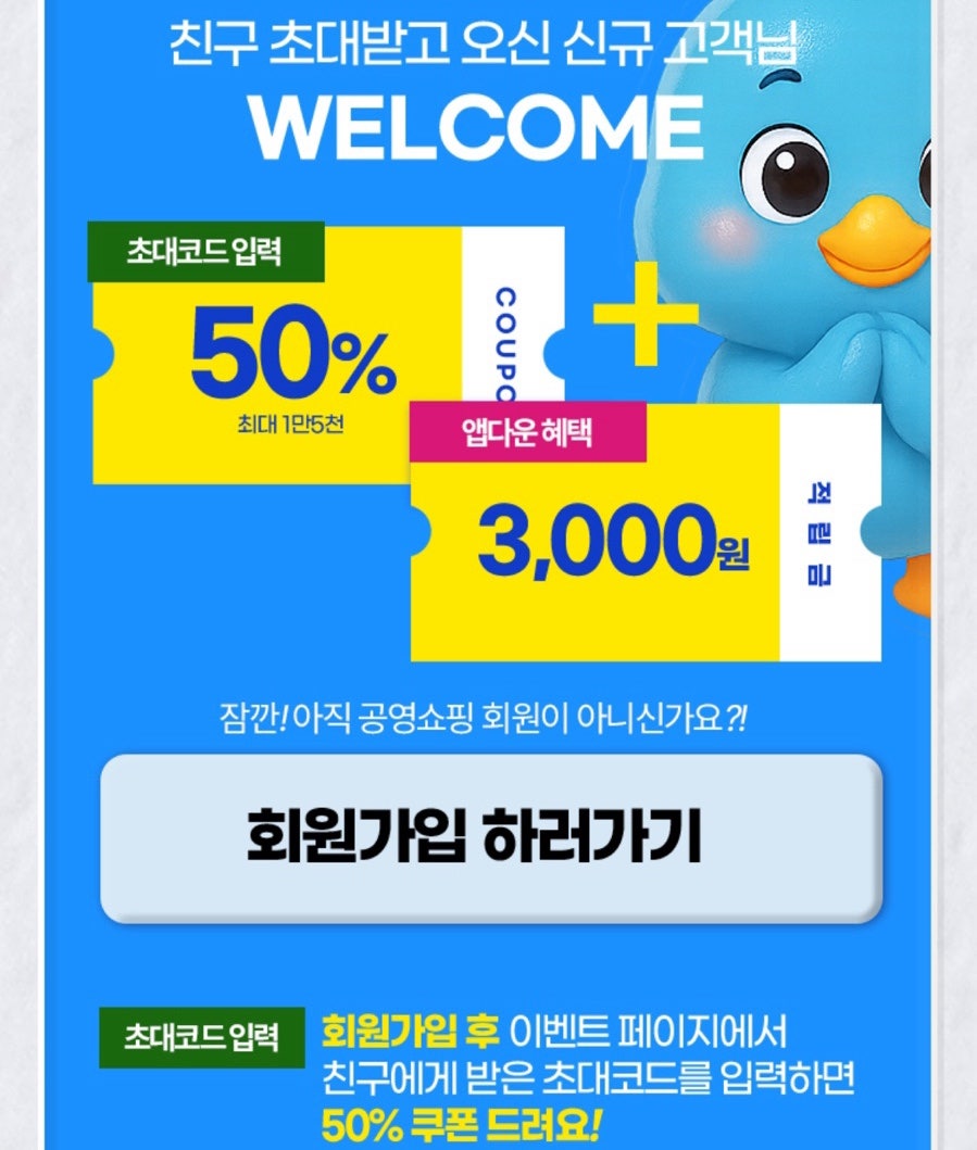 🎁공영쇼핑 신규 50%할인쿠폰 + 적립금 3,000P